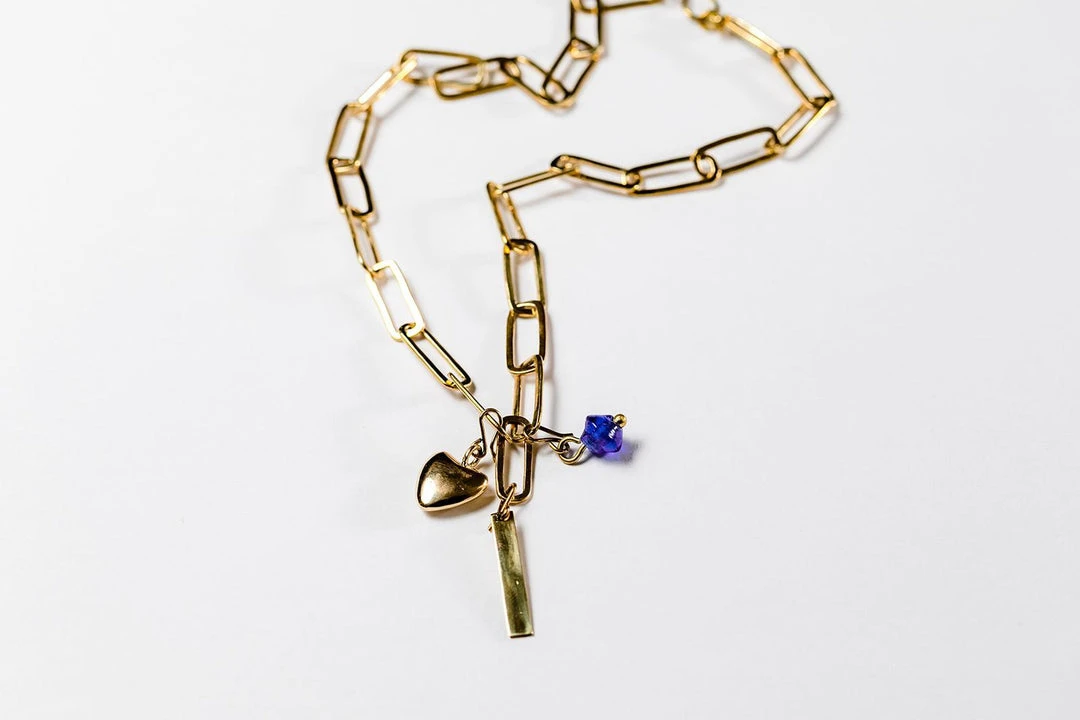 This necklace can be worn in endless ways utilizing the charms or keeping it simple and just wearing the chain. You will love the simple chain stacked with the Natalie Necklace or Marcella Necklace too. Handcrafted from brass and upcycled glass by artisans in Kenya being paid a fair wage.