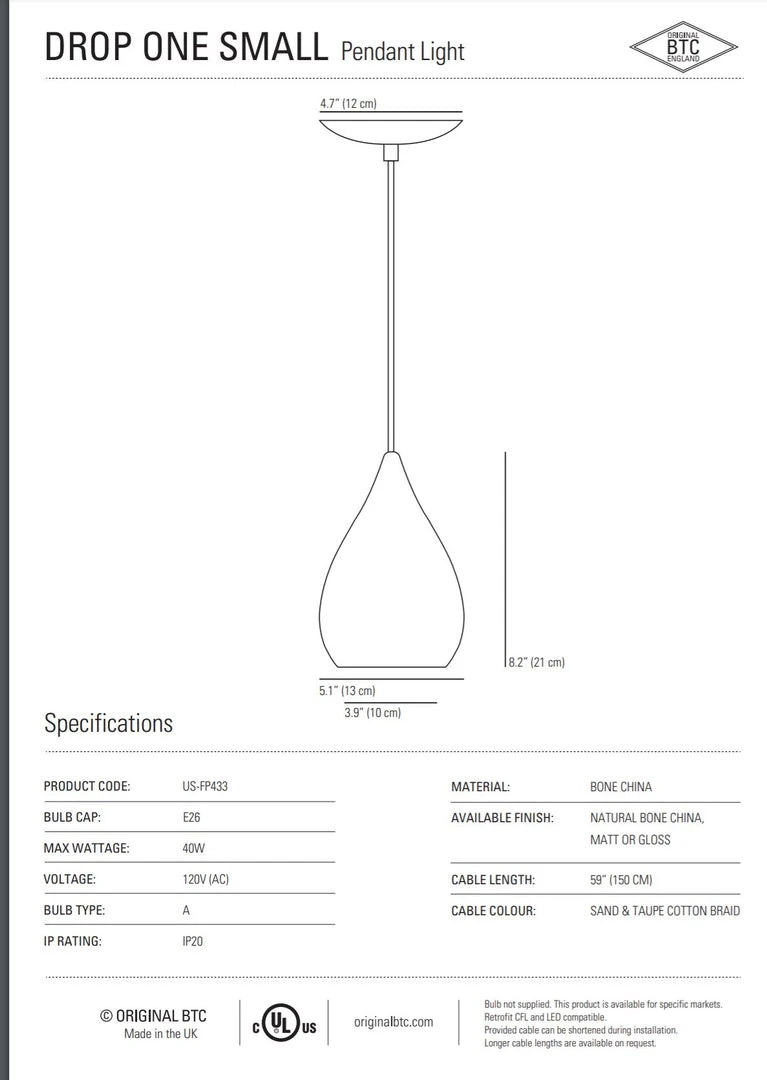 Original BTC is a family-owned and family-run lighting company based in London, England using only the finest natural and raw materials sourced in the United Kingdom for their high-quality, handmade lighting. Each piece of Original BTC’s exemplary table, floor, pendant and wall sconce lighting are crafted with care by ceramicists, metalworkers, and nautical craftspeople dedicated to making only the world’s finest lighting. Original BTC’s lighting is recyclable and is made to last generations using bone china light fittings, solid aluminum, copper, brass, and iron. Each piece of lighting is accentuated by cotton braided cables, exceptional satin chrome bases and a beautiful array of colored shades. All Original BTC’s products are UL certified, all components made in England, and all workers are paid a living wage.