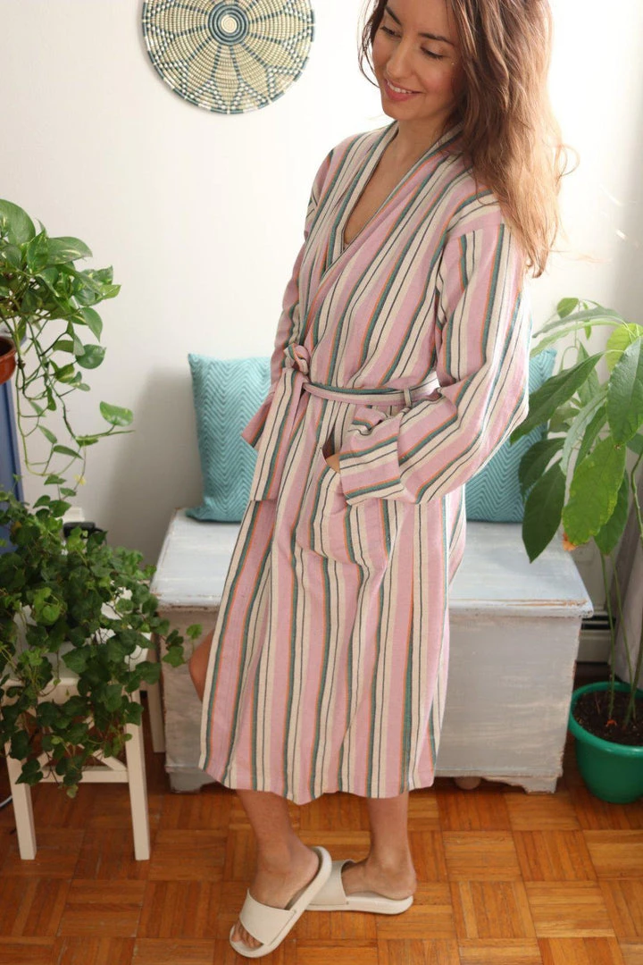 The Kai Robe is a modern spin on the classic Turkish towel that makes a lightweight bathrobe or a luxurious garment to wear while relaxing at home.
