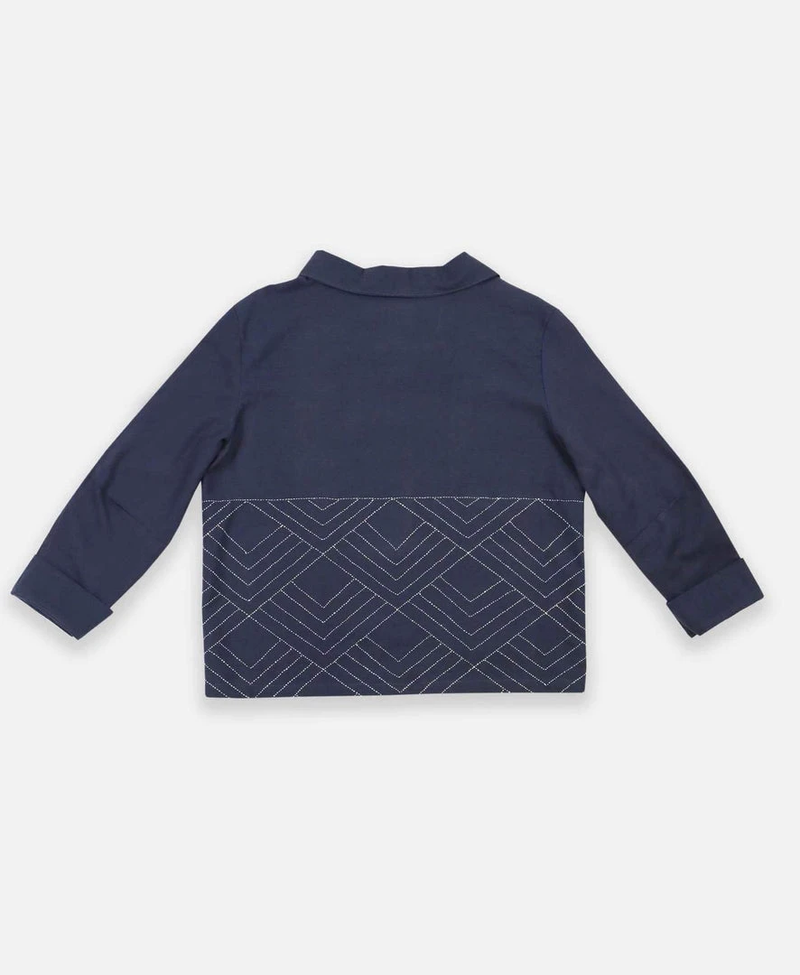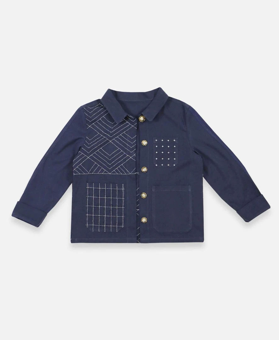 This twill-canvas chore jacket features modern pattern blocking with three front-patch pockets, a delicate cross-stitch design, and an art deco-inspired style. Its boxy fit and button-front closure make this jacket perfect for layering over a basic t-shirt or cozy sweater.