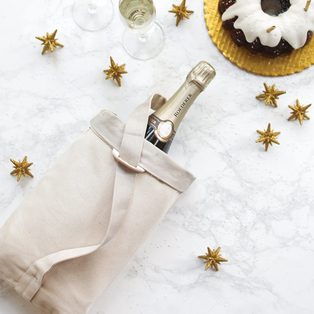 This Vin Wine Tote is designed to hold two bottles, with an interior sleeve for added protection. The adjustable strap can be carried from the top or slung over the shoulder. Perfect for casual picnics, toting wine, and gifting for all occasions. Zero-waste sustainable design. Holds two standard bottles as wide as 4 1/2” in diameter vertically, or a baguette and bundles of flowers.
