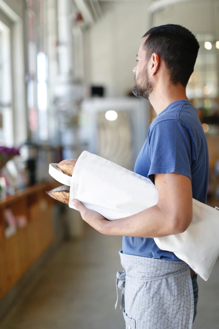 The baguette tote holds two baguettes and has an adjustable strap that can be carried from the top or slung over the shoulder. The bread’s loose flour will coat the canvas, building a protective layer to keep the bread fresh.