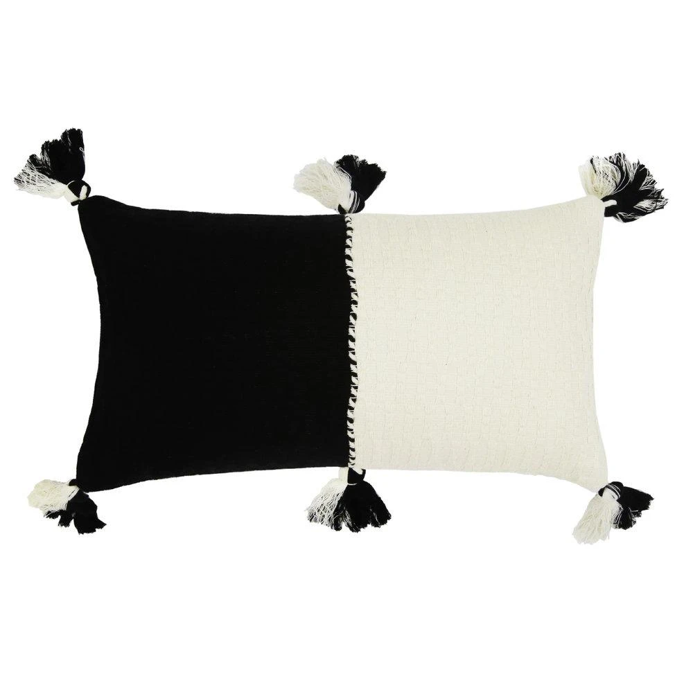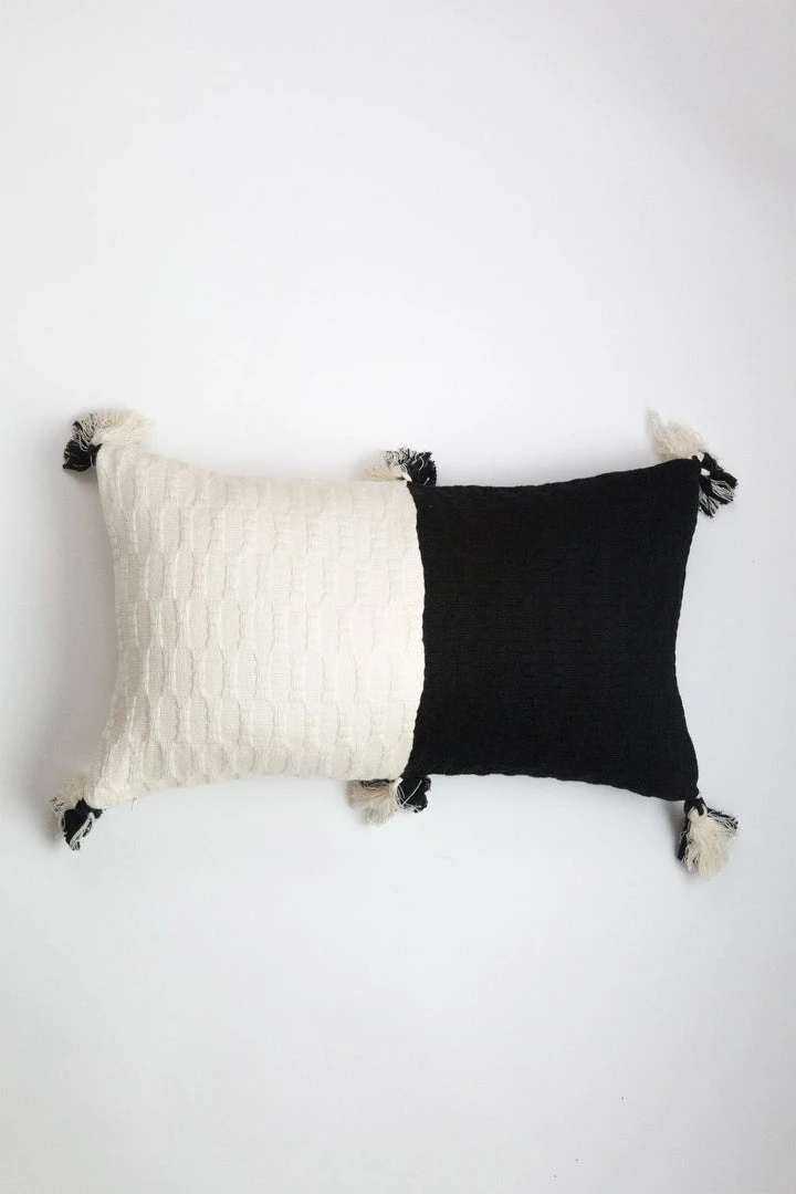 This white and black pillow is inspired by traditional textiles from Almolonga, Guatemala. The cotton used to make this pillow was handwoven by artisans using a back-strap loom.