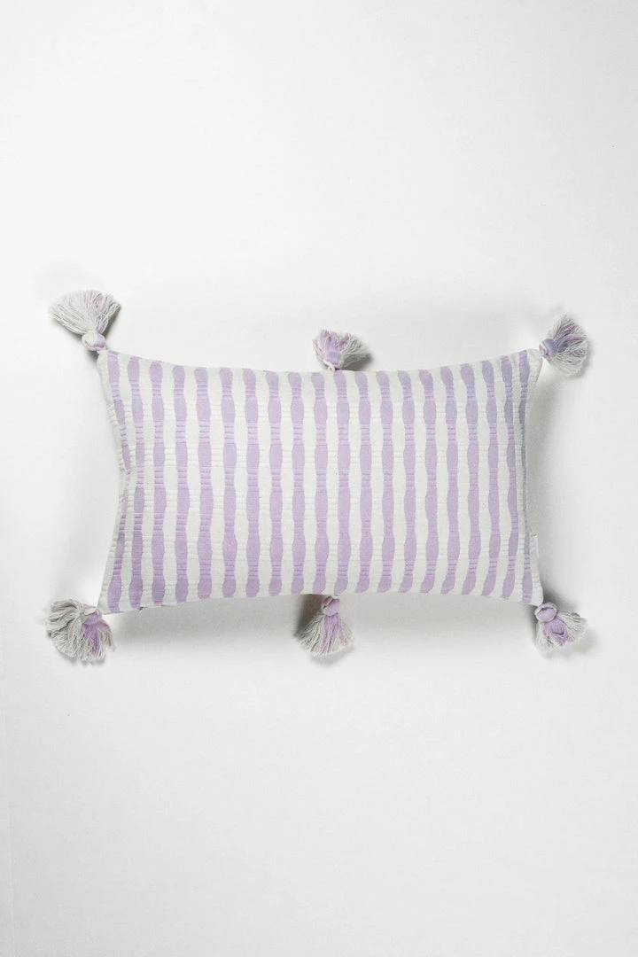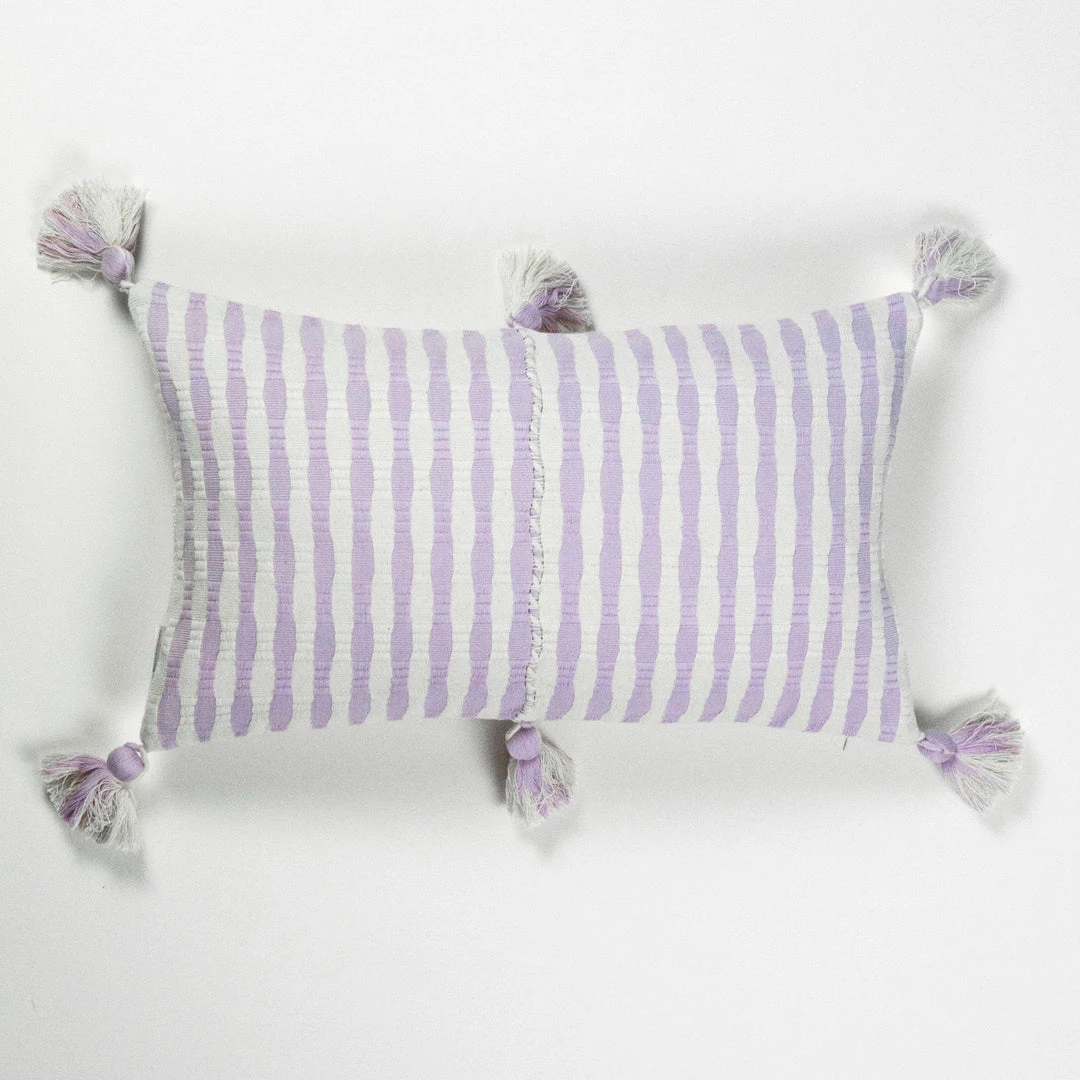 This light lavender stripe pillow is inspired by traditional textiles from Almolonga, Guatemala. The cotton used to make this pillow was handwoven by artisans using a back-strap loom.