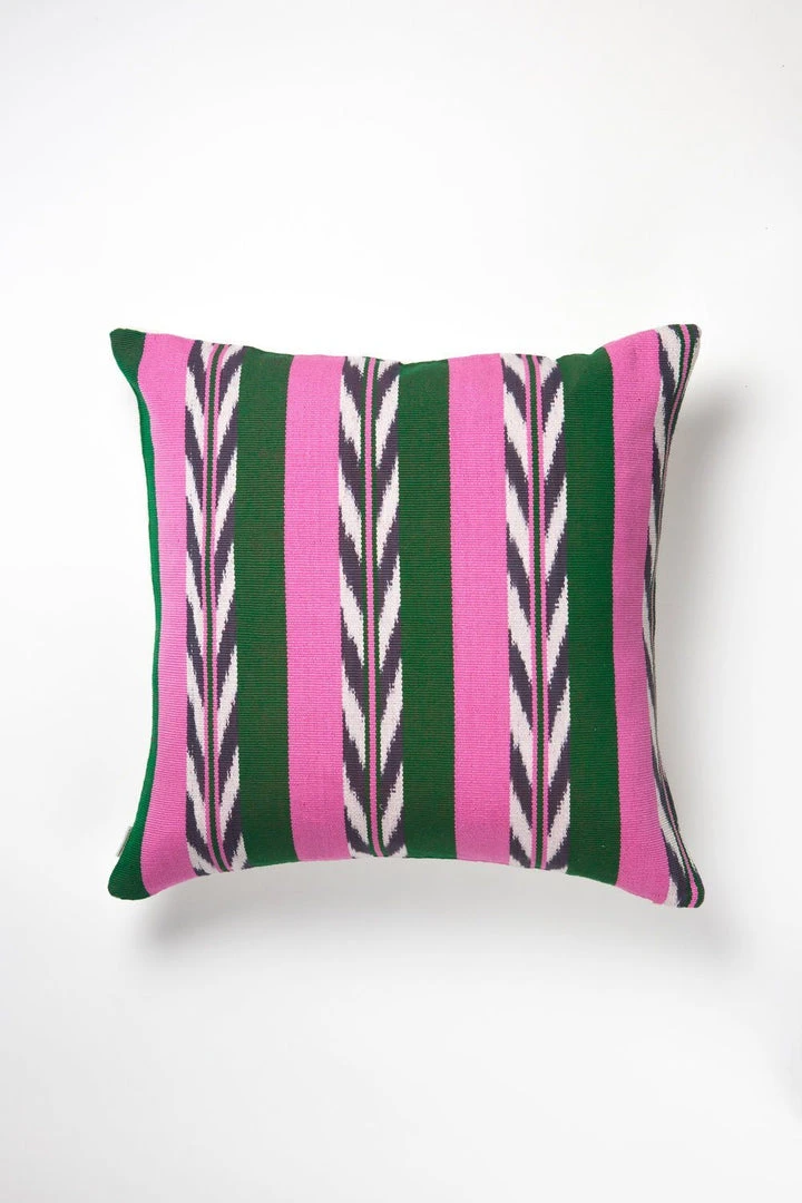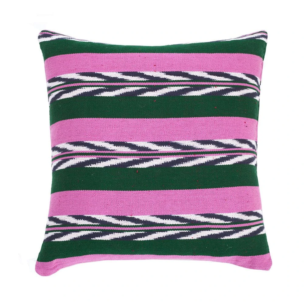 This green and pink pillow is handwoven by artisans in the village of Totonicapan, Guatemala. Complete the set with the matching blanket and lumbar pillow.