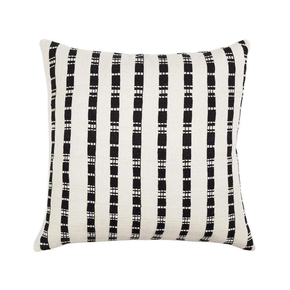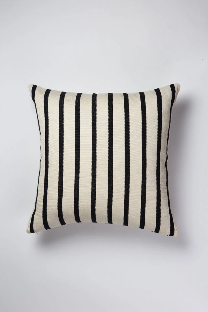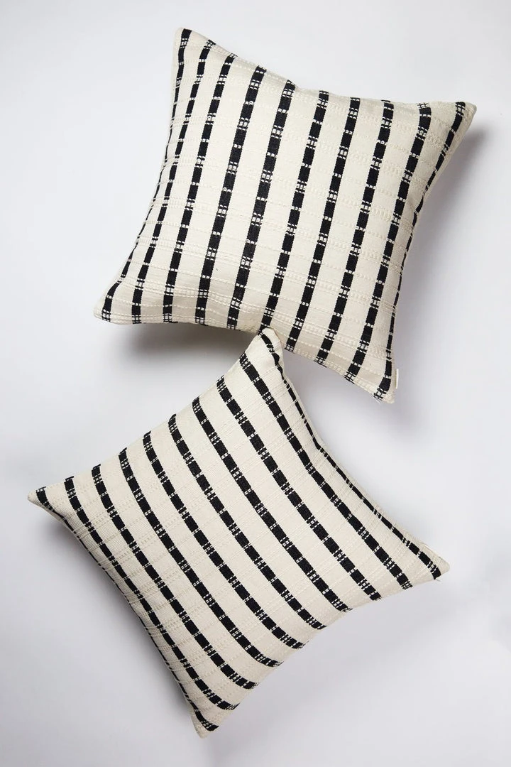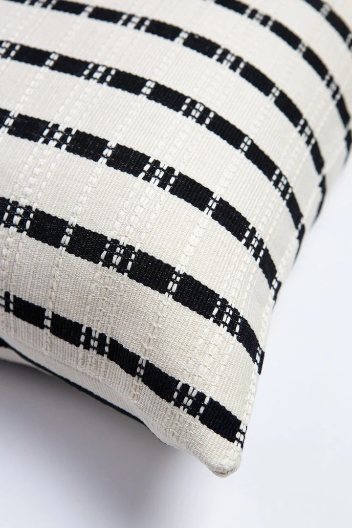 This black and white pillow was handwoven on a back-strap loom by artisans from the village of Nahuala, Guatemala.