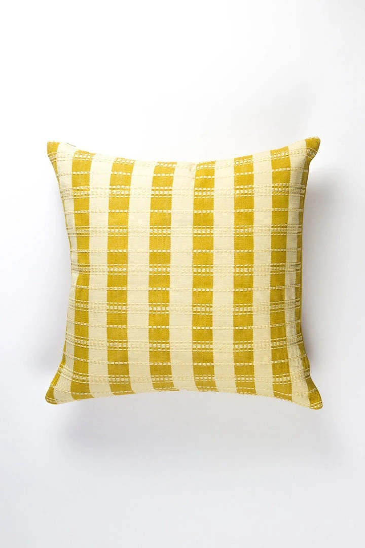 This butter yellow pillow was handwoven on a back-strap loom by artisans from the village of Nahuala, Guatemala.