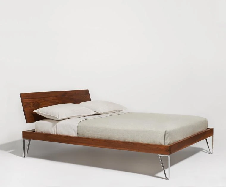 Bed frame in solid American white oak or walnut with an oil finish or FSC certified sustainable ash with a whitewash water-based finish. Die-cast aluminum legs and support, and poplar wood slats. The mattress sits 13″ from the floor. Designed by Magnus Lundstrom & Anki Spets.