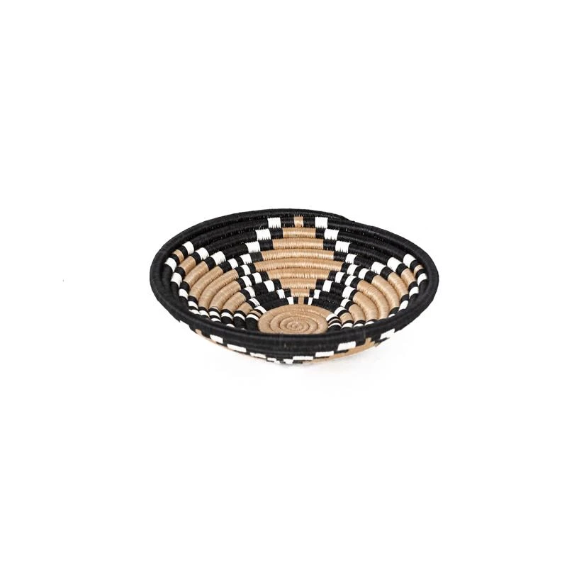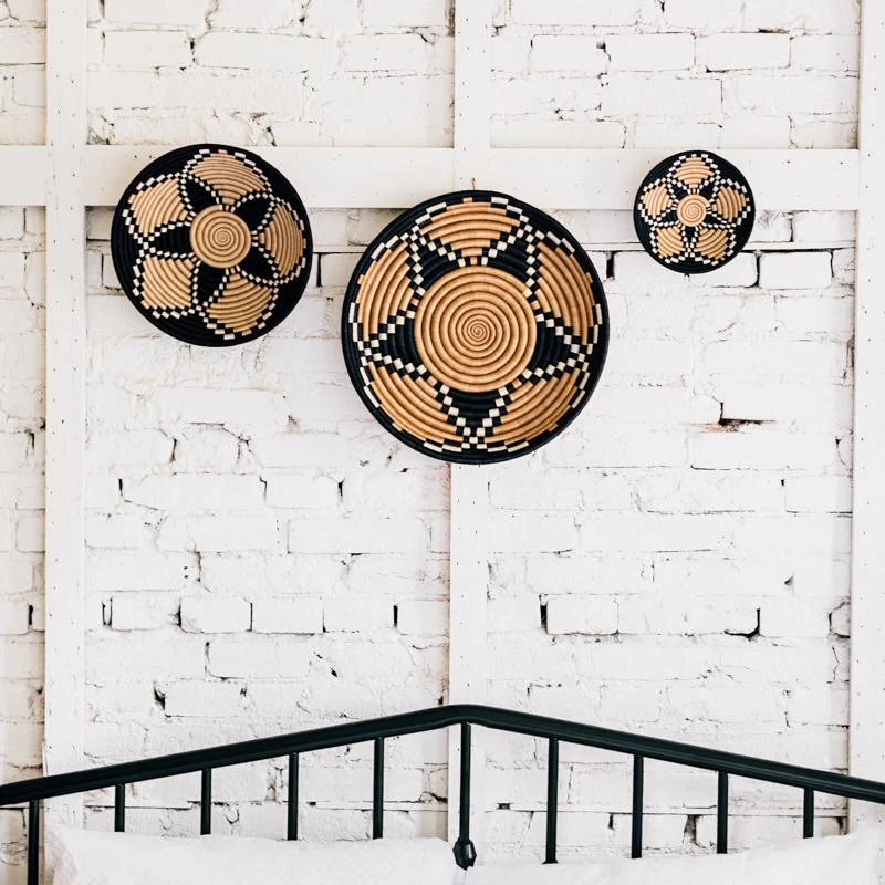 The large woven bowl is flat on the bottom and makes a beautiful tray for serving or display. Imagine the medium bowl on your dining room table filled with warm bread or fruit. The small bowl is a beautiful way to hold jewelry or keys, or it may be filled with small treats and used as a gift basket. Each woven bowl has a loop on the back for hanging- the trio looks gorgeous on a blank wall.