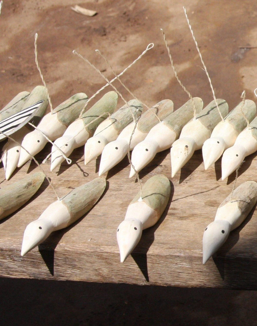 Jacaranda trees add to the beauty of Rwanda, with their feathery leaves and small purple flowers. They are also special in that they grow back after being cut. Artisans use Jacaranda branches to carve these charming little birds, which are similar in size to Rwandan fire finches.