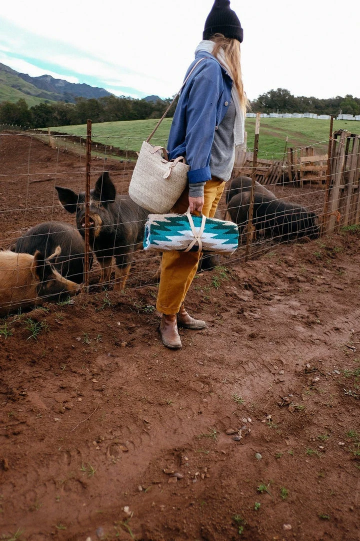 The Mercado basket is the perfect everyday purse with its crossbody shoulder strap and leather tote handles. It features a velcro closure. Please note basket and leather straps are hand made and colors will vary.