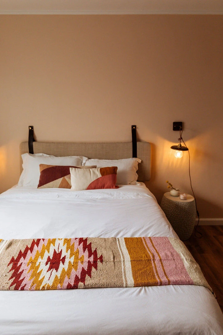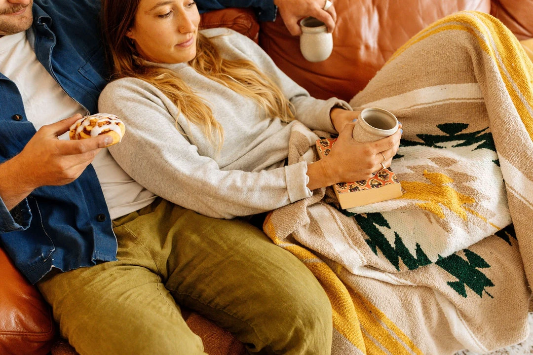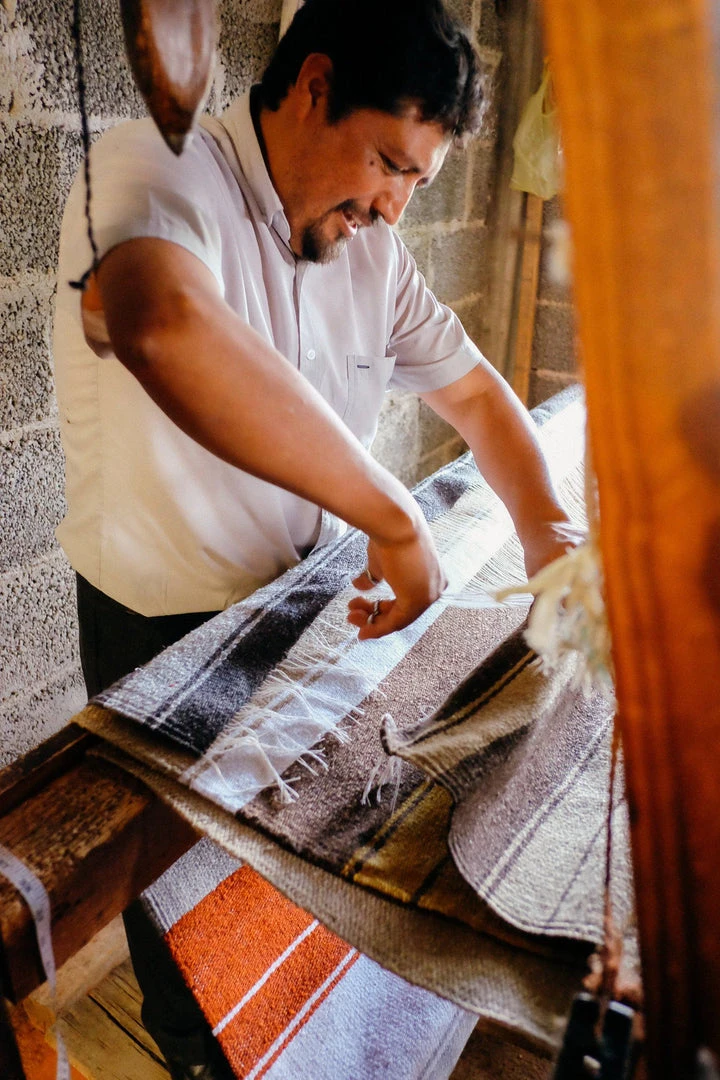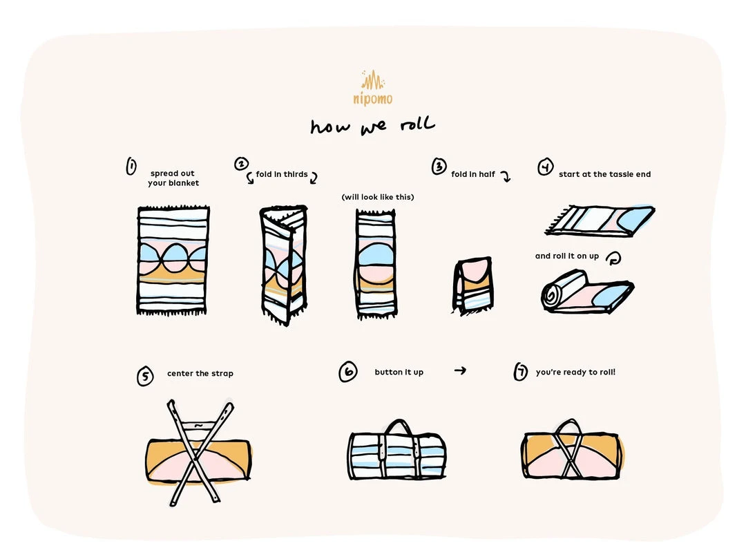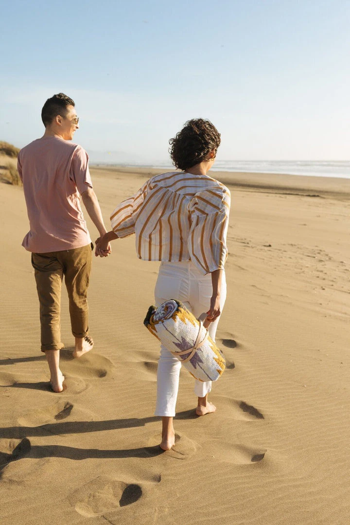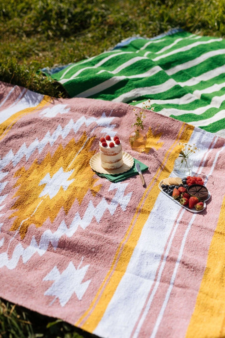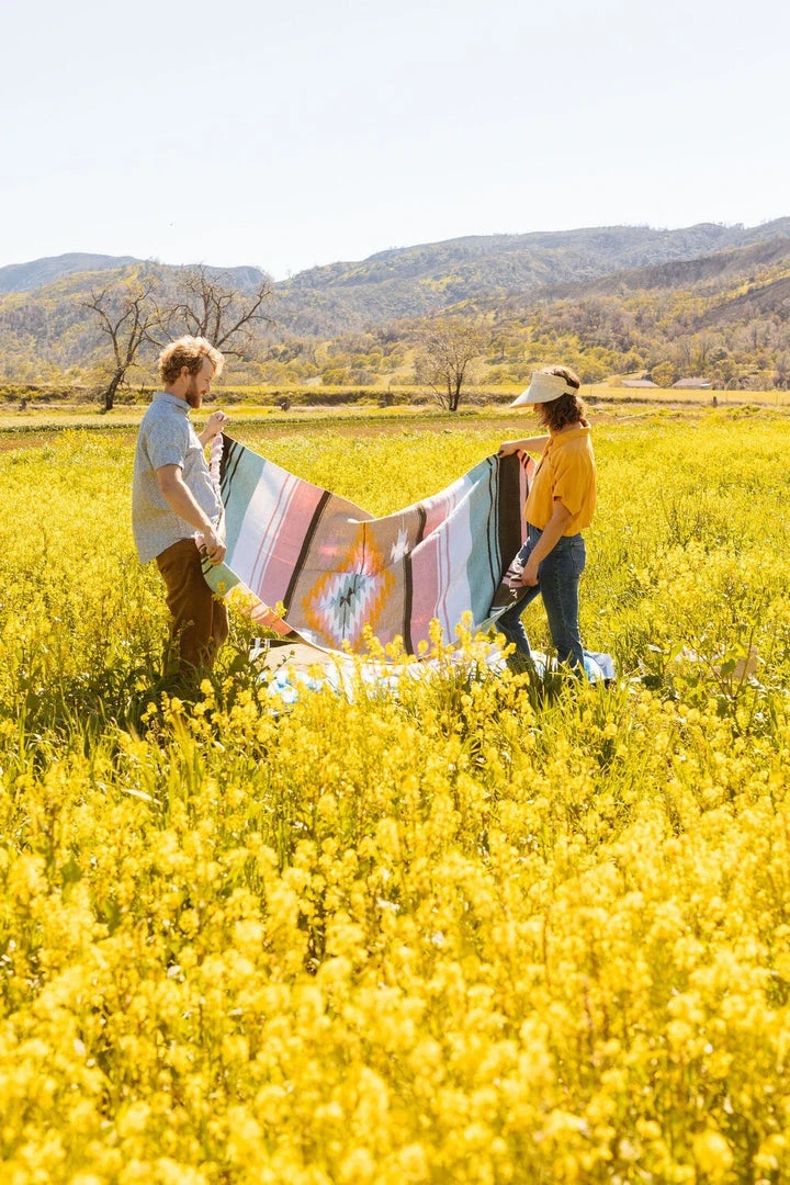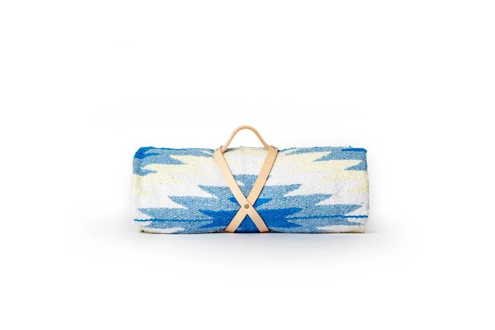 Perfect for hanging out at the park, beach, or even keeping warm around a campfire. Your new blanket comes rolled up with a handmade leather strap, making it ready for any adventure. These vibrant, modern blankets are handwoven in Mexico using upcycled yarn from the garment industry.