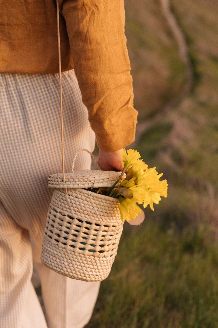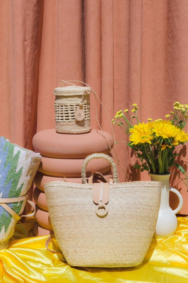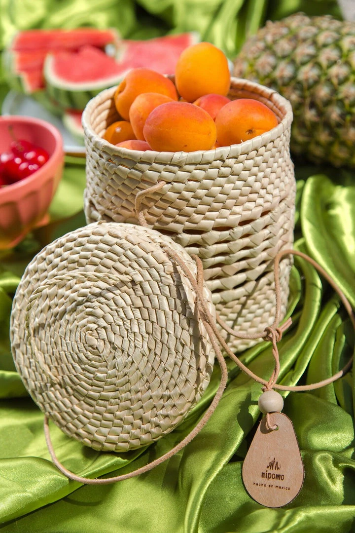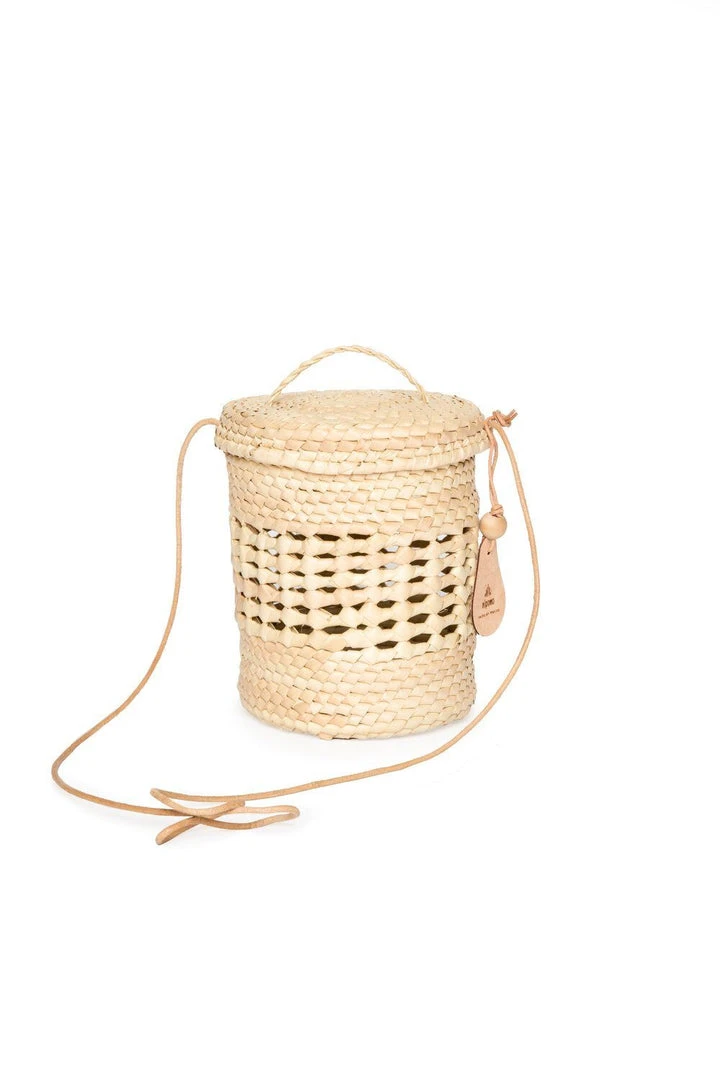 The Lantern Canasta is a round structured basket that features a handy round lid that is attached through the leather corded strap. This little cutie is the perfect go-to day bag – it fits a phone, wallet, keys, and even a sunglass case (or about 18 apricots). Please note basket and leather straps are hand made and colors will vary.