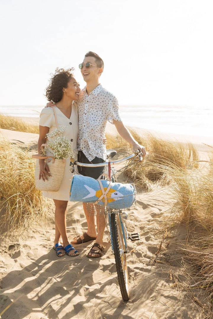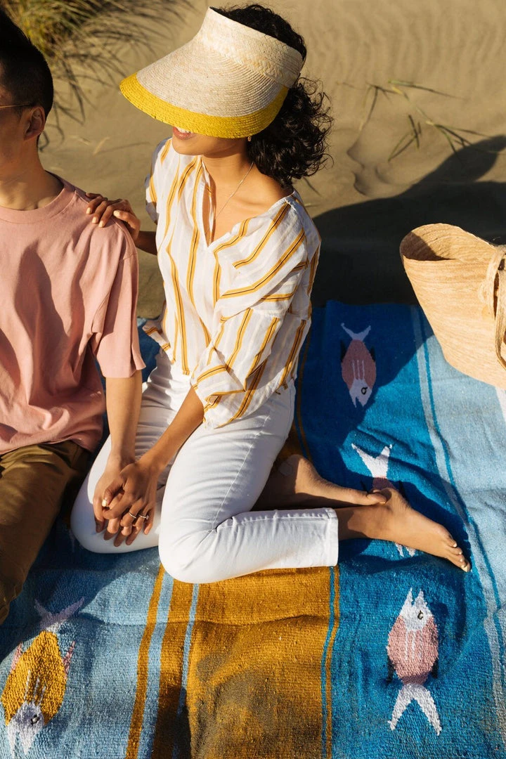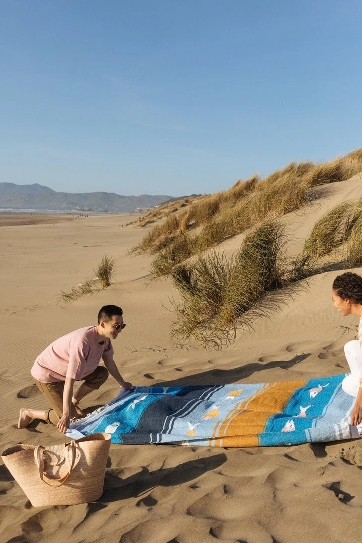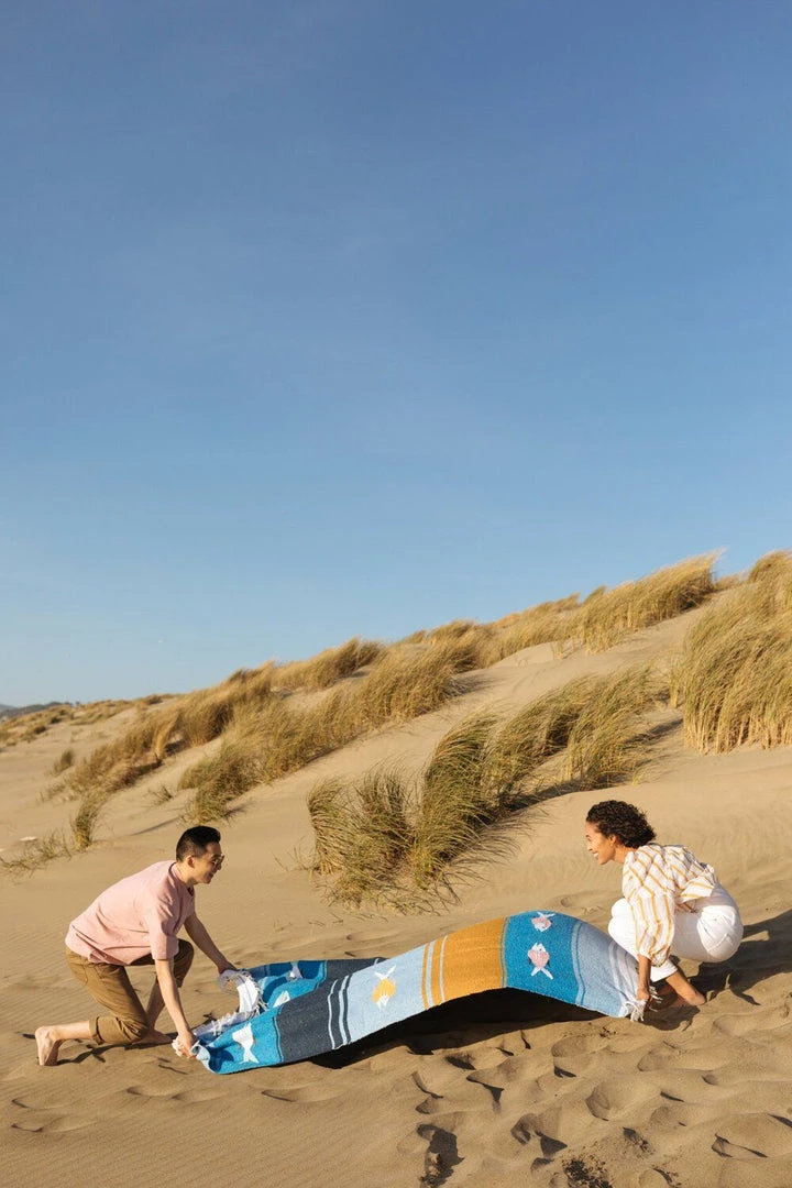 Woven fish playfully swim along colored bands in the Pez Azul blanket. The blue tones in the blanket along with a sunny golden band recall warm days spent at the seaside. We hope this blanket brings some summery goodness with you anywhere you go. They are big enough for a 2 – 4 person picnic and roll up in thirds for easy transport. These vibrant, modern blankets are handwoven in Mexico using upcycled yarn from the garment industry.