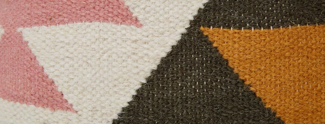 The Desert Kilim Geometric Pillow merges traditional kilim patterns and techniques with modern aesthetics inspired by the colors of the desert sky. The 100% wool exterior adds a natural texture. Master weavers in Panipat, India create each decorative pillow with care on a panja loom.