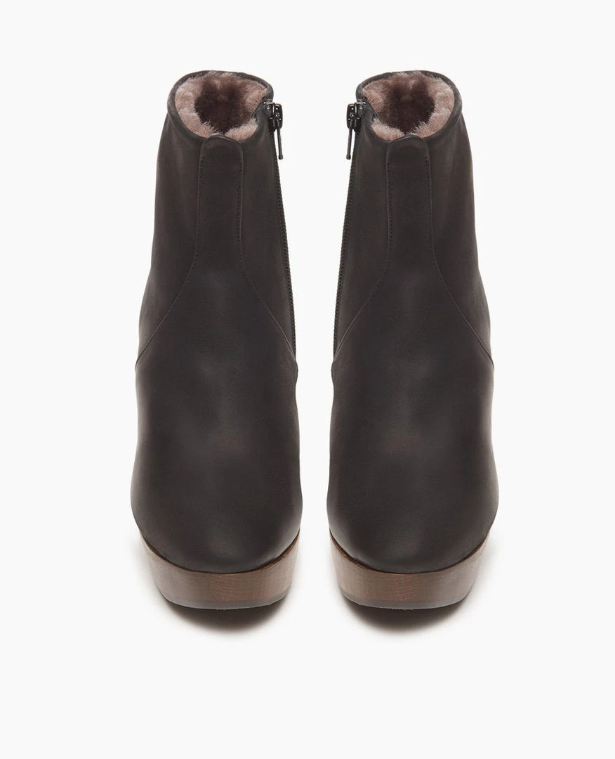 Coclico’s classic Tecla clog boot now with full shearling lining. The Taus’s clean lines, snug fit and curved solid wood platform heel make this clog boot a timeless staple of any wardrobe. Features an inside zipper closure.