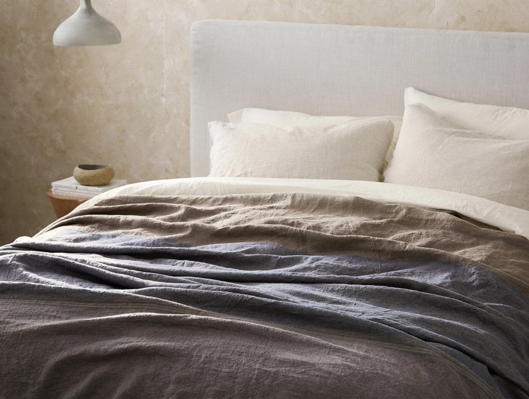 The bed blanket is designed with a color block pattern that runs horizontally along your bed. Large bands of plain weave canvas blend with twill, while stripes of dobby woven details highlight the transitions.