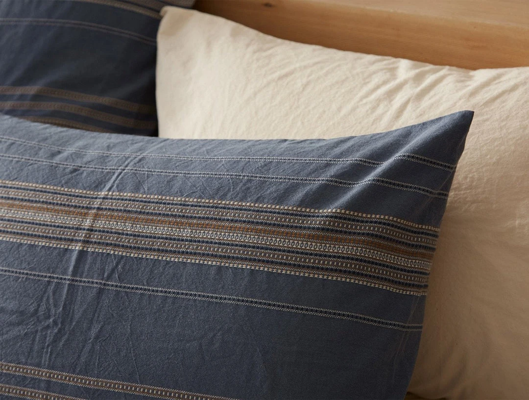 Organic cotton chambray is detailed with textural dobby-woven stripes. Each stripe is composed of a series of small geometric patterns. Refined texture is yarn-dyed for lasting color. Backed with plain weave chambray.