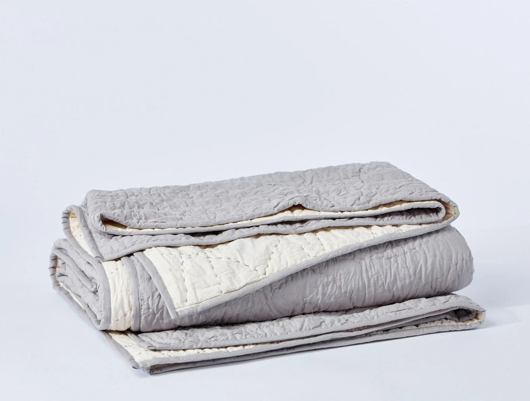 Inspired by the sculptural art of basket-weaving, this organic cotton quilt mimics the imperfect, organic curves of nature. Handstitched kantha thread is quilted throughout, creating a reversible product with contrast stitching that stands out against the undyed backing. Like crinkled percale fabric, this woven quilt has a relaxed drape that embraces its casual feel with every wash. Mid-weight and perfect for layering, with a simple ½” binding.