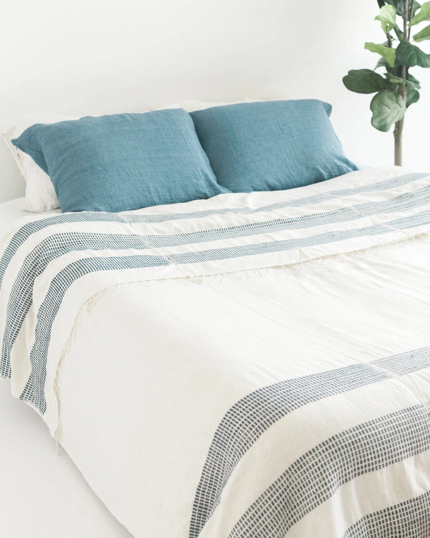 This versatile lightweight queen blanket showcases the best in luxury bedding. Each piece is meticulously hand-woven in Ethiopia and features a bold color-blocked dotted pattern. Three separate panels are then bound together using traditional stitching techniques. Hand-spun Ethiopian cotton offers a uniquely rich texture that will continue to soften with each wash and dry.