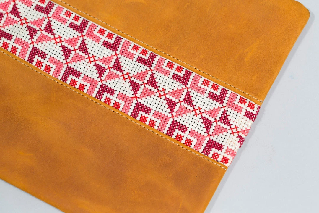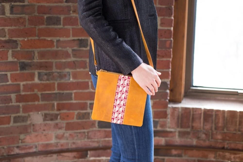 Darzah’s tatreez crossbody bags are perfect for carrying the essentials, measuring 8″ x 8″ and made with camel brown cow leather from Palestine. Each bag is hand-embroidered with by refugee and low-income women artisans with a traditional Palestinian tatreez design, the “slices” motif, and crafted with locally sourced leather in Al Khalil (Hebron). Lined with cotton and designed with an interior pocket and zipper closure. “Shaqhat” means slices in Arabic.