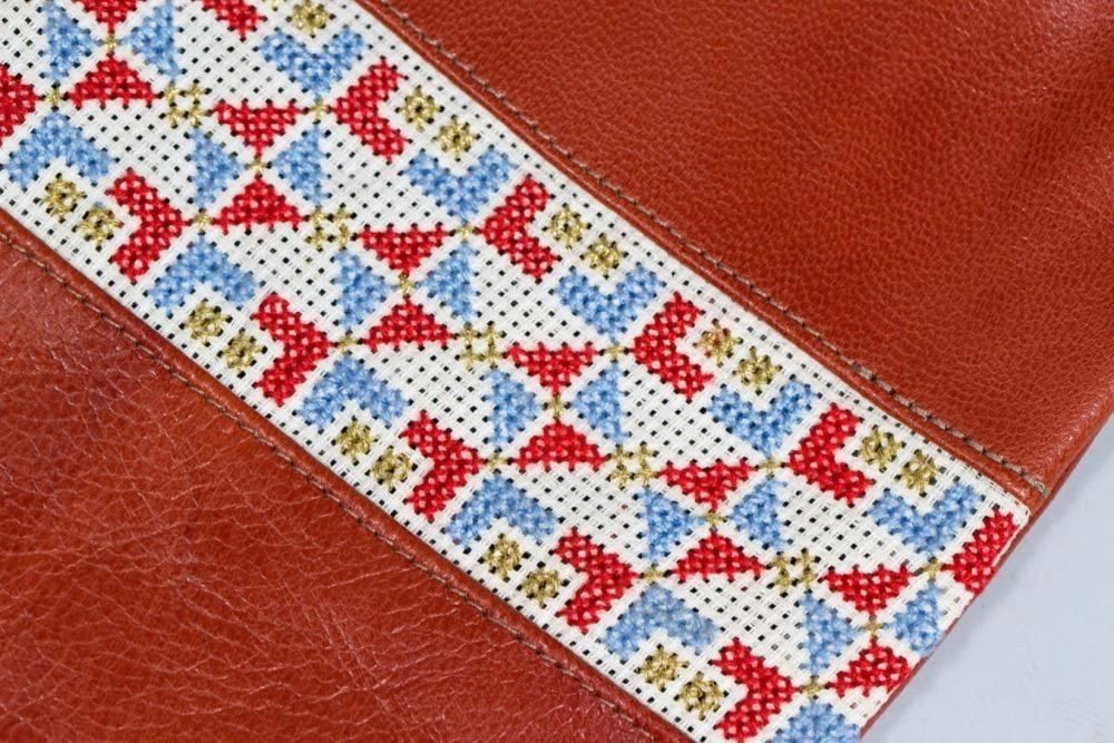 The tatreez crossbody bags are perfect for carrying the essentials, measuring 8″ x 8″ and made with gorgeous burnt red goat leather from Palestine. Each piece is hand-embroidered by refugee and low-income women artisans with a traditional Palestinian tatreez design, the “slices” motif, and crafted with locally sourced leather in Al Khalil (Hebron). Lined with cotton and designed with an interior pocket and zipper.