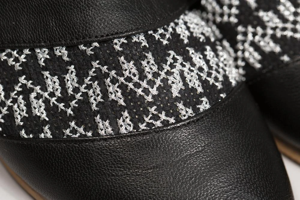 Ethical fashion from Palestine. The tatreez leather flats are a modern take on a traditional Palestinian art form. Each pair is hand-embroidered by refugee and low-income women artisans with traditional Palestinian tatreez design.