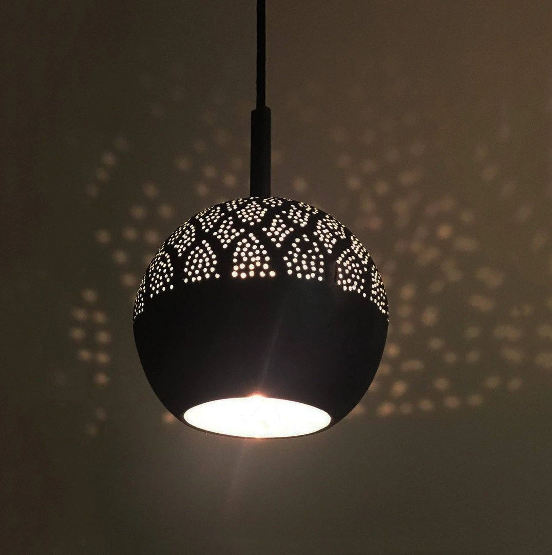 This modern Moroccan pendant light is a harmonious marriage between traditional craftsmanship and modern design. The negative space directs all focus to the elaborate design seen at the top of this exquisite pendant lamp. Nur casts brilliant shadows onto the ceiling, while creating a focused light at the base, making a perfect addition to dining and living spaces.