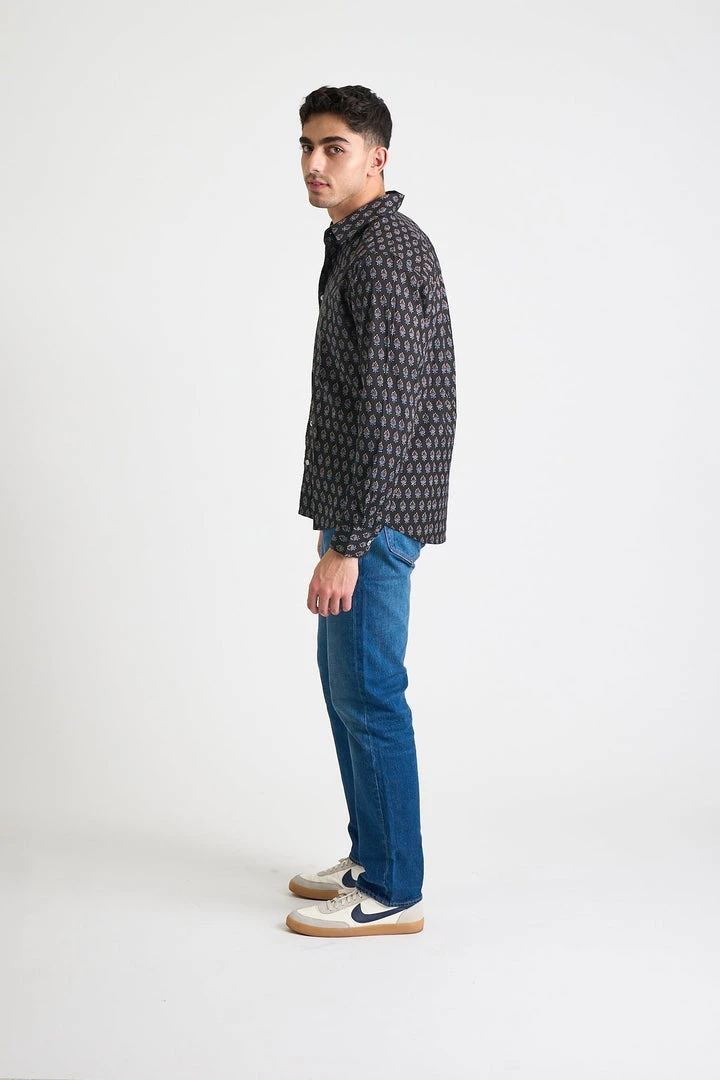 The Amir Shirt is a modern take on a classic long sleeve button down, featuring a red and blue motif over black fabric. Made in small batches with hand screen printed techniques, which results in natural inconsistencies giving this shirt an elevated, handcrafted look. Please note that the actual color may differ from the pictures due to computer lighting and hand-made nature of the fabric.