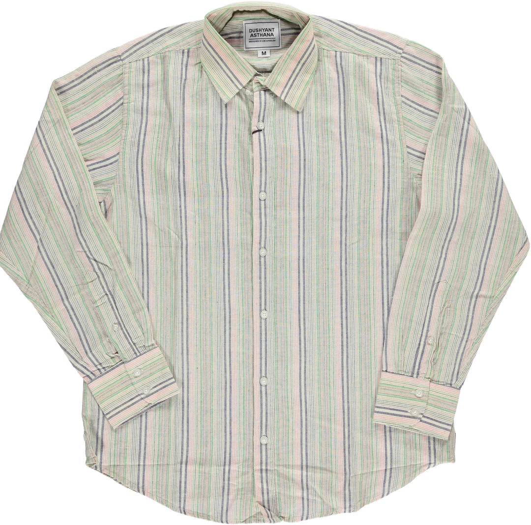 A classic striped button down shirt with multicolored stripes to add an edge to your sustainable wardrobe. This men’s button down shirt is perfect for both casual and dressed up outfits. Handwoven cotton designed in Los Angeles and made in a fair trade environment in India.