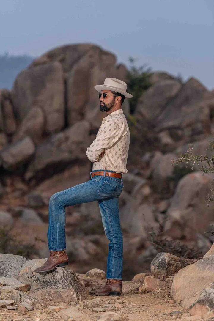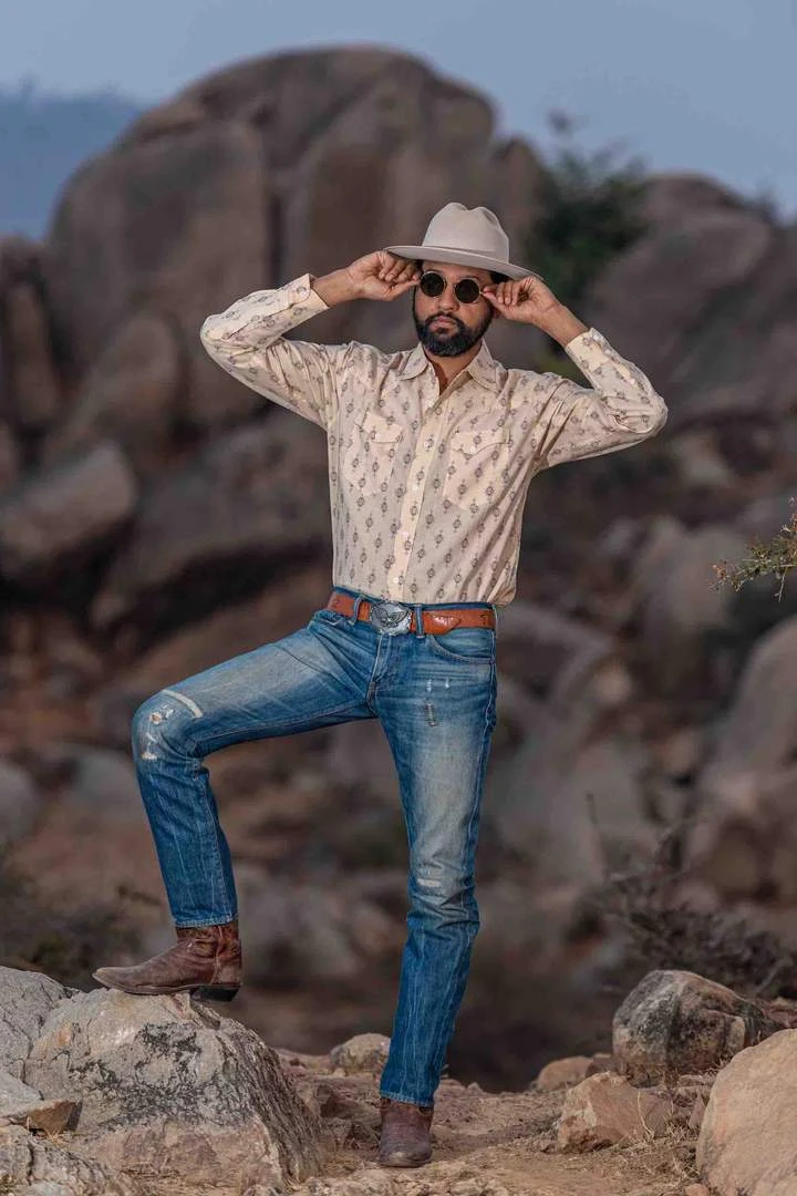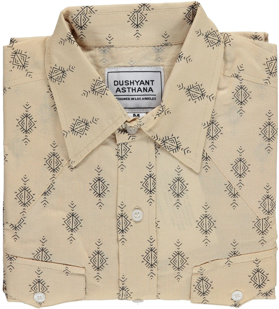 A western style men’s button down shirt with a hand printed motif on a cream background. The perfect addition to men’s sustainable wardrobes, this long sleeve button down can be dressed up or worn casually. Designed in Los Angeles and hand block printed in a fair trade environment in India.