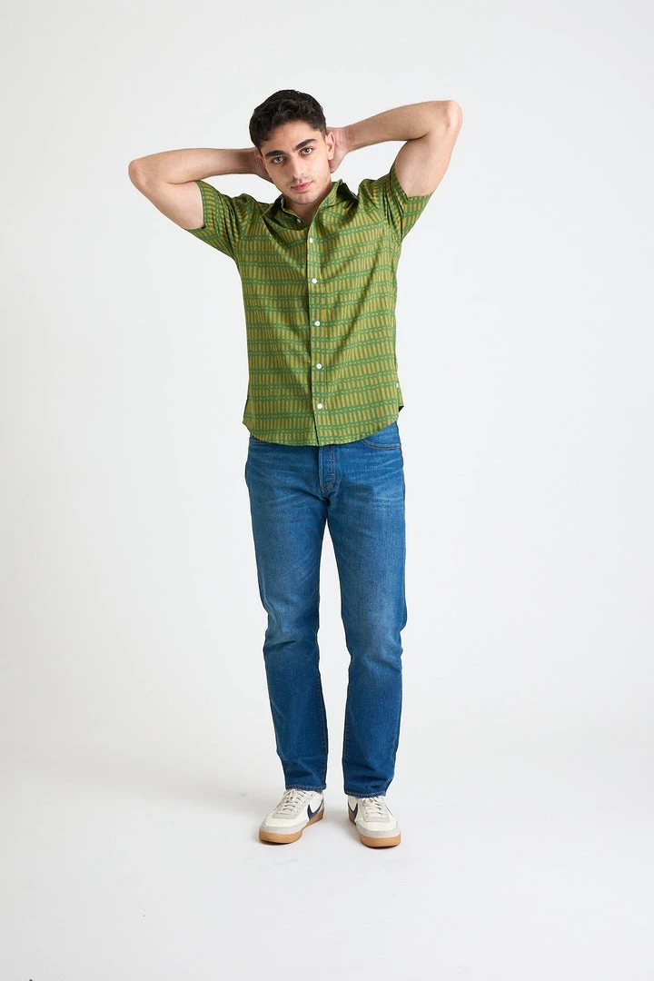The Prat Short Sleeve Shirt is an everyday shirt with an elevated look. The Green Sticks design fabric is hand screen printed in small batches, which naturally have inconsistencies giving this shirt an elevated handcrafted look. Please note that the actual color of the shirt may differ from the pictures due to computer lighting and hand-made nature of the fabric.