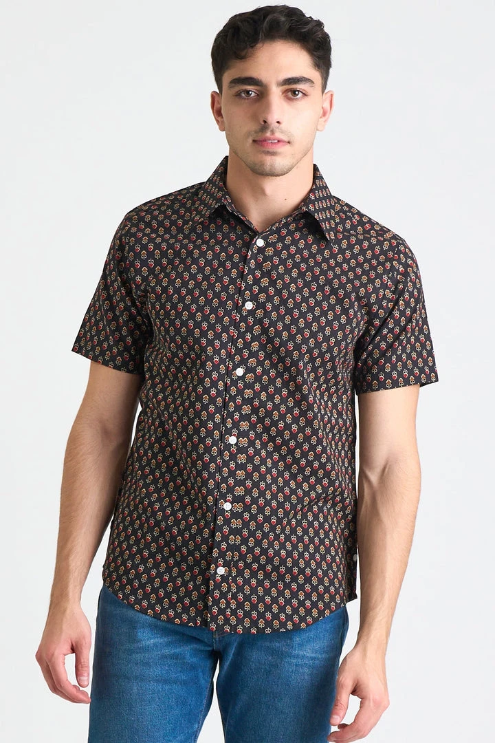 The Prat Short Sleeve Shirt is an everyday shirt with an elevated look. The Spades design features a red and brown motif on black fabric and is made with hand screen printed fabric in small batches, which naturally have inconsistencies giving this shirt an elevated handcrafted look. Please note that the actual color of the shirt may differ from the pictures due to computer lighting and hand-made nature of the fabric.
