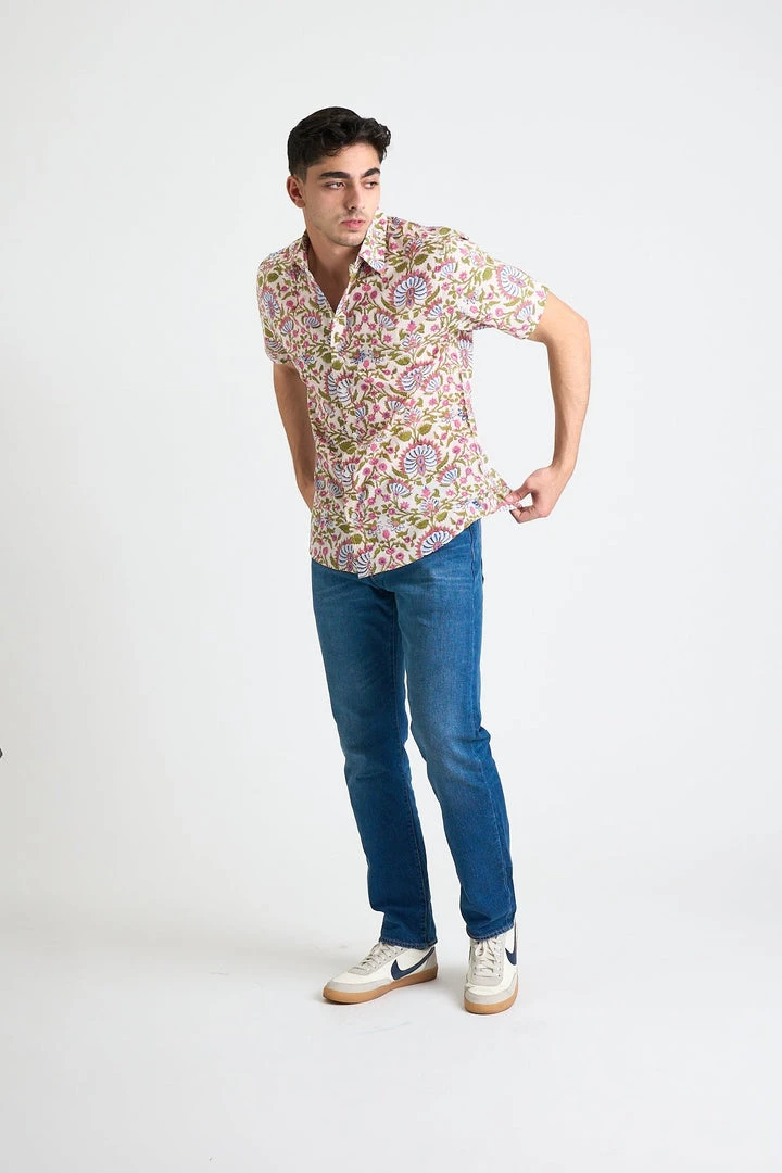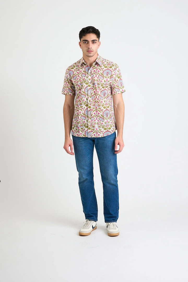 The Prat Short Sleeve Shirt is an everyday shirt with an elevated look, inspired by Mughal Textiles. Featuring a white and pink floral print that is hand block printed in small batches, which naturally have inconsistencies giving this shirt an elevated handcrafted look. Please note that the actual color of the shirt may differ from the pictures due to computer lighting and hand-made nature of the fabric.
