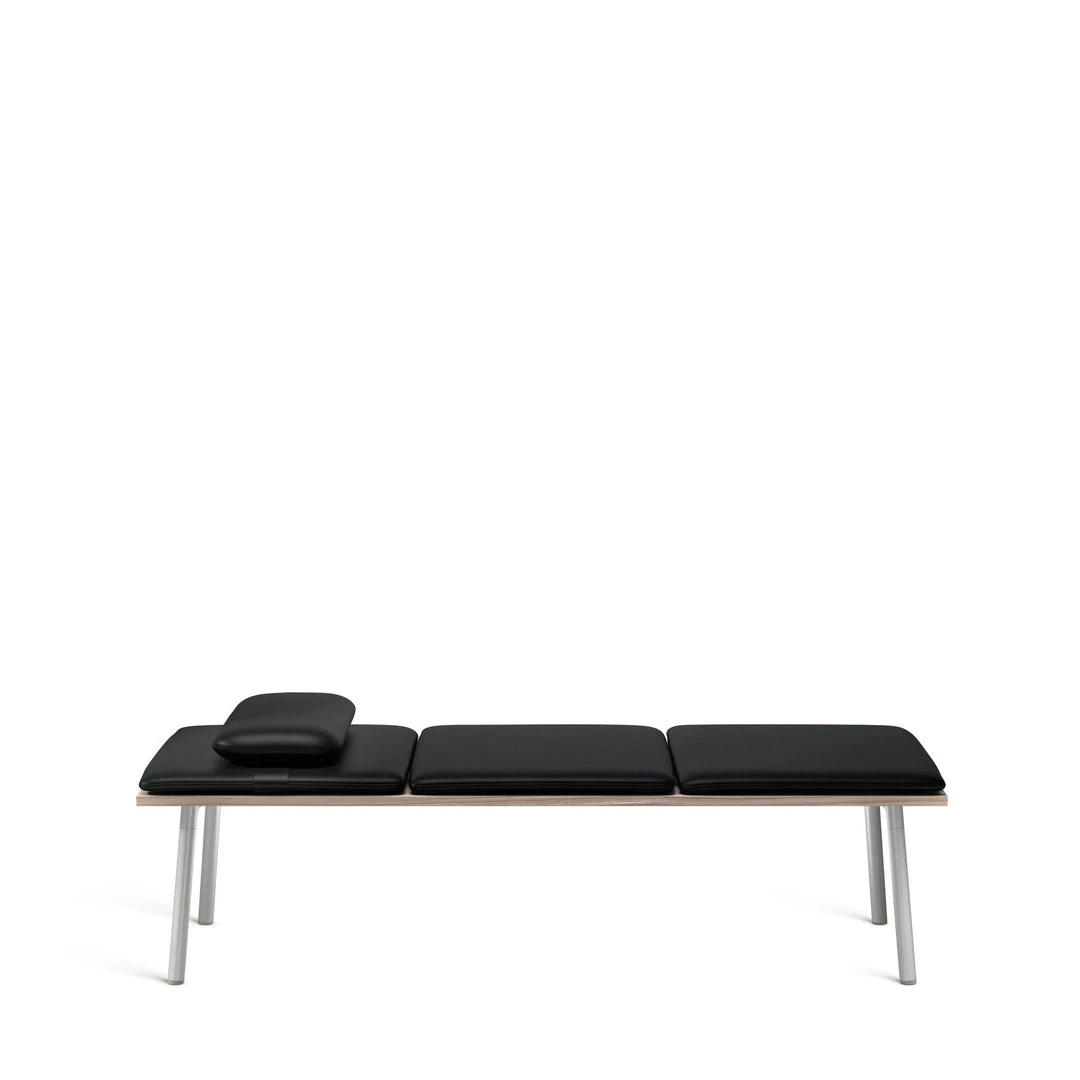 The daybed is the latest addition to Emeco’s Run collection, designed by Sam Hecht and Kim Colin of Industrial Facility. Built from the same solid wood tops and strong aluminum base as the Run tables, the daybed is completed by three cushions and a bolster. Run daybed is offered with a top in solid ash or walnut all sustainably sourced and crafted locally by Amish woodworkers in Lancaster, PA. The cushions are upholstered in a timeless selection of Maharam Bask leather or Kvadrat Hallingdal fabric.
