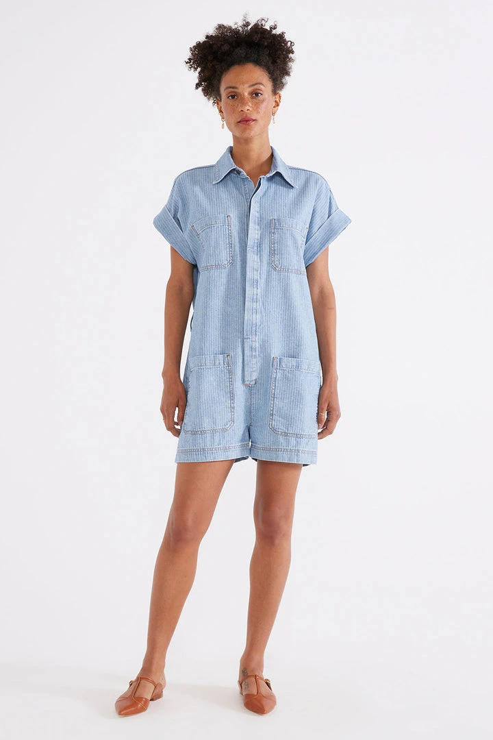 The Adeya Romper is an easy-fitting, everyday romper with utility pocket details and self belt. A soft textured stripe fabric finishes the look.