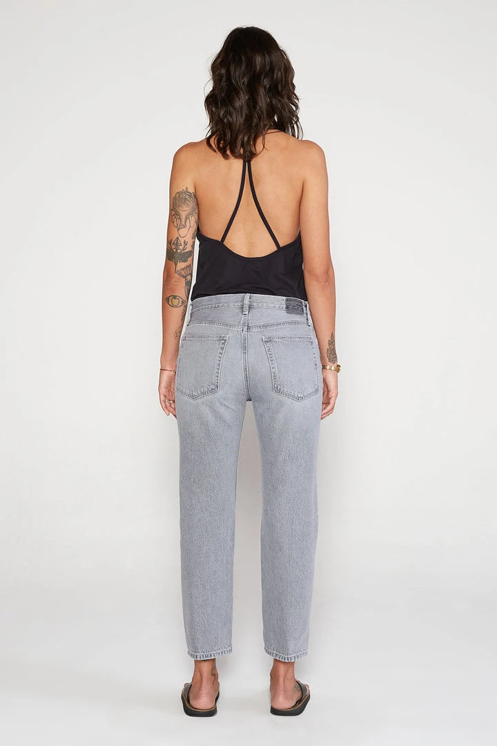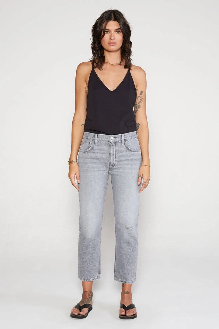 A clean straight fit with an easy rise and vintage construction. Rhea is fitted through the hip, then easy through the leg. A cool gray wash lightens the mood.