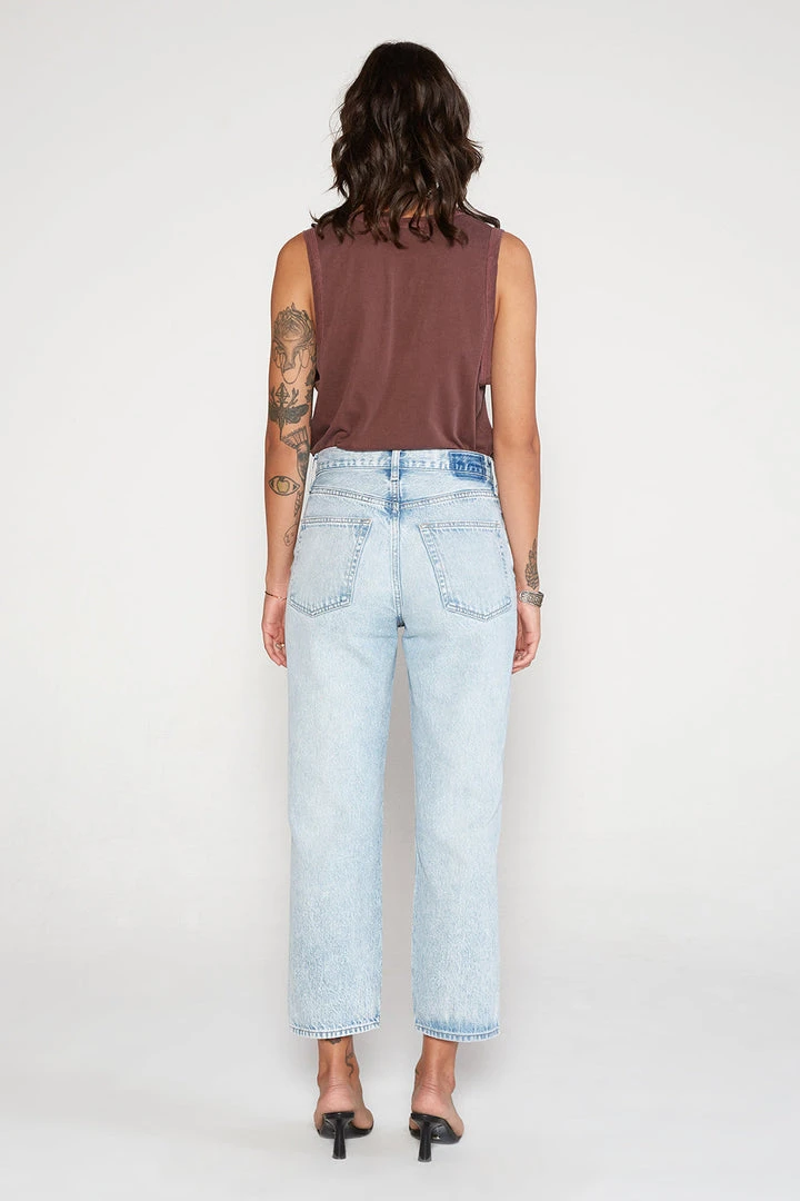 A high-rise straight with authentic vintage styling. Fitted through the hip, easy in the thigh, then straight down to a cropped hem. A cool marbled wash adds an edge to this soft organic cotton/tencel blend denim.