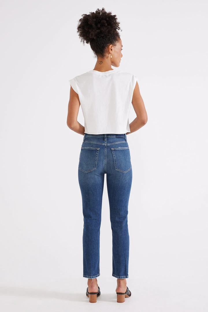 Form-fitting but never tight, Scarlet fits slim through the hip with a bit of room through the leg. A soft, organic comfort stretch denim provides movement and breathability. Finished with a seasonless Beach Break dark wash and careful fading for a lived-in look.