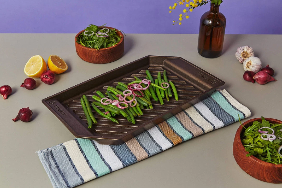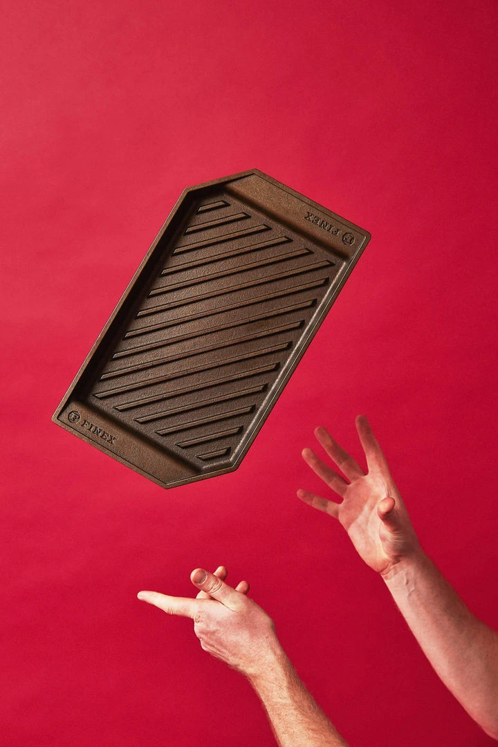 Domed surface: Domed interior surface drains excess fat and juices to the corners of the pan, reducing smoke and delivering FINEX true grilling flavor, without the fat.