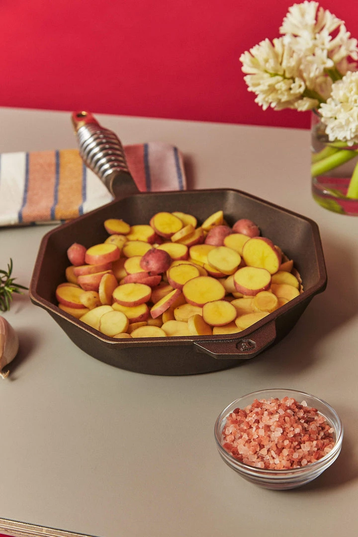 Angled sides: Eight rounded corners serve as pour spouts that seal up tight or serve as evenly spaced steam vents with the matching lid. Eight flat sides make it easier to get a spatula behind the crust on cornbread, pizza and other baked goods – and make it easier to squeeze a couple skillets into a crowded oven. Thick bases & walls distribute heat better, delivering stronger searing and more even cooking on any heat source.