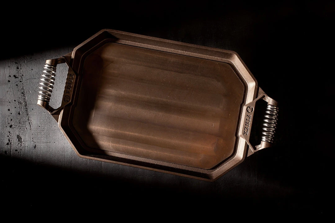 Ready to cook right out of the box, each cast iron piece comes pre-seasoned with 100% organic flaxseed oil, giving it a non-stick, rust-resistant bronze finish that will patina, darken and continue to improve as you cook.