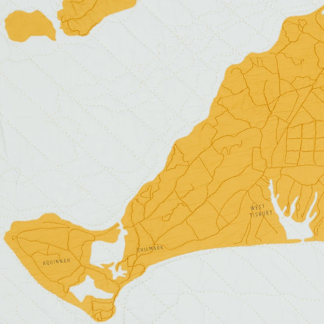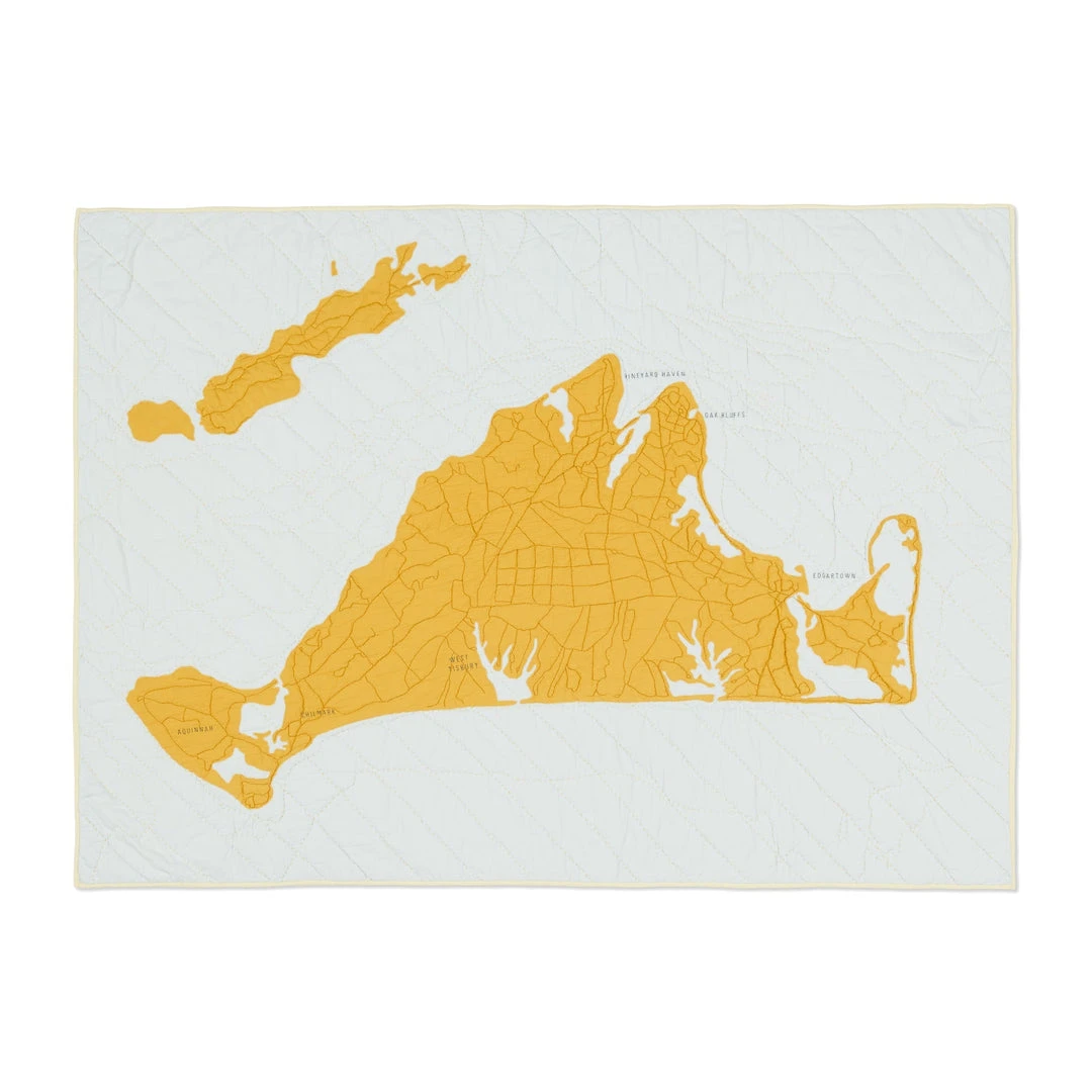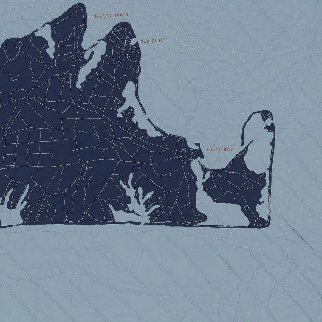The Martha’s Vineyard organic cotton quilt features a quilted map of the popular Summer getaway destination with the embroidered names of Edgartown, Oak Bluffs, Vineyard Haven, and Aquinnah. Style it on your couch, favorite reading chair, or on the wall as a tapestry.