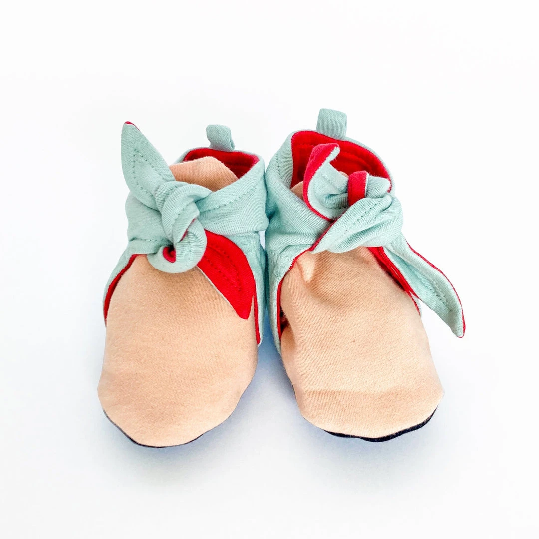 These sweet, soft booties wrap your little one’s feet in warmth. The Star Stuff Baby Booties feature appliquéd cotton sun and moon are layered over black cotton jersey, with hand-guided machine embroidery. Motifs inspired by quilts of the mid 19th Century, whose makers drew comfort from the patterns found in nature.