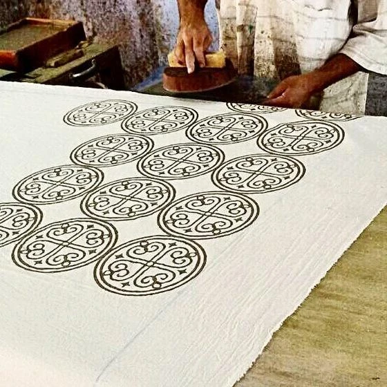 These medium weight curtains boarder on opaque while still letting some light in and providing privacy. This Circle and diamond design is inspired by a door from the Grecian islands. The print went through a multiple printing process. Starting with printing a mud resist for the big circle, then dyeing it in light indigo, and then printing mud resist again for the diamond shape, then dyeing it again in dark indigo to create the multiple color dazzle.