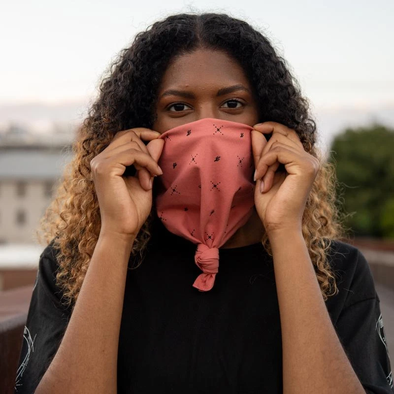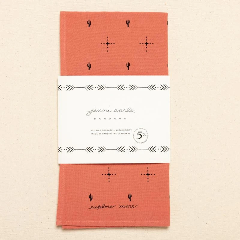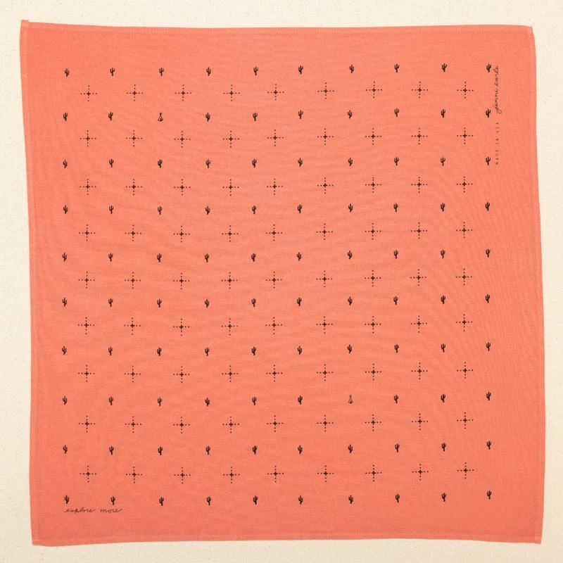 Use this bandana as a talisman to encourage adventure. Wear or tuck this super soft hand-dyed and triple washed bandana to add interest to any ensemble. This bandana features a hand-drawn desert design that is printed onto cotton.
