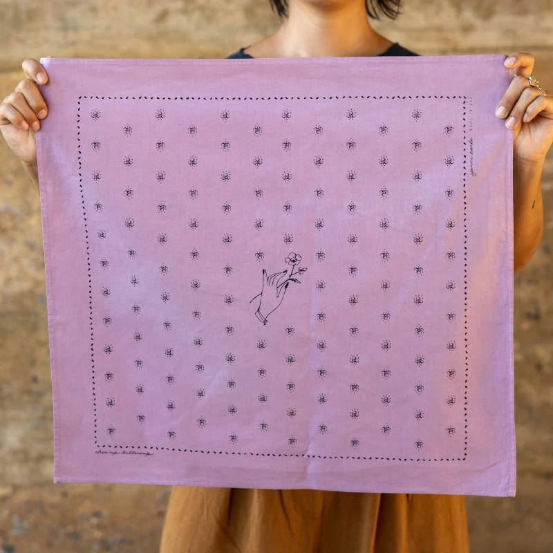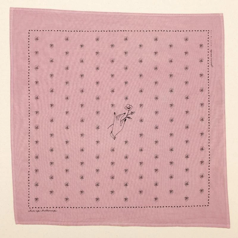 This bandana features a hand-drawn floral design, with a seeded border and center hand with an offering of a buttercup with the words “chin up buttercup” on one corner.