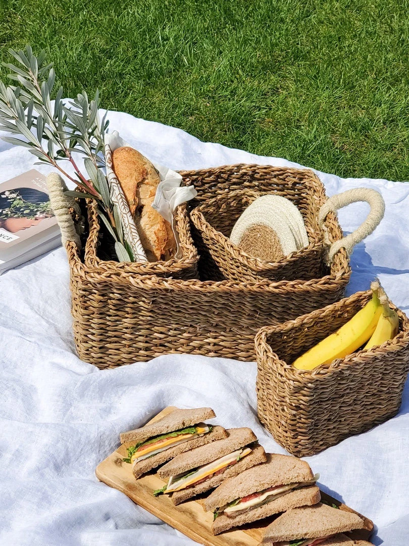 A set of baskets that all fit together, perfect for kitchen storage, organizing cosmetics and crafts, and anything else in your house. Each basket is made with ethically sourced, natural materials and handwoven in a fair trade environment. Variation is celebrated with handcrafted products.