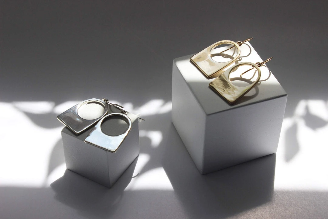 These architectural statement earrings are sculpted and carved in wax by hand, then cast. Easily dressed up for a night out or worn with a t-shirt and jeans to add shine to a casual look.