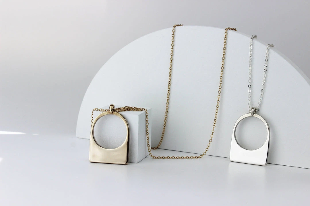 This simple, geometric necklace will add interest to any outfit. Featuring playful shapes, it will quickly become your favorite statement piece.